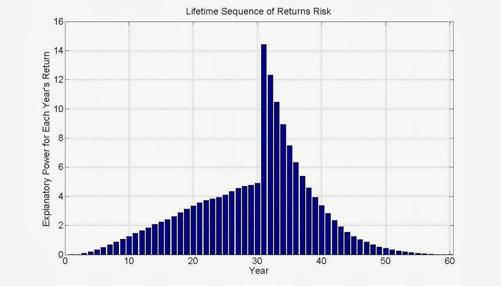 Once again, sequence of return risk affects you during both the accumulation phase and the distribution phase of wealth, if you add or withdraw a fixed amount of money. Below is an important graph depicting the effect of each year’s return on TPV (Pfau 2013). We are particularly vulnerable to what happens at the beginning of the distribution phase and in the 4-5 years following the start date of distribution. In fact, the first year’s return has a staggering 14% effect, which gradually reduces to around 7% by the 5th year.