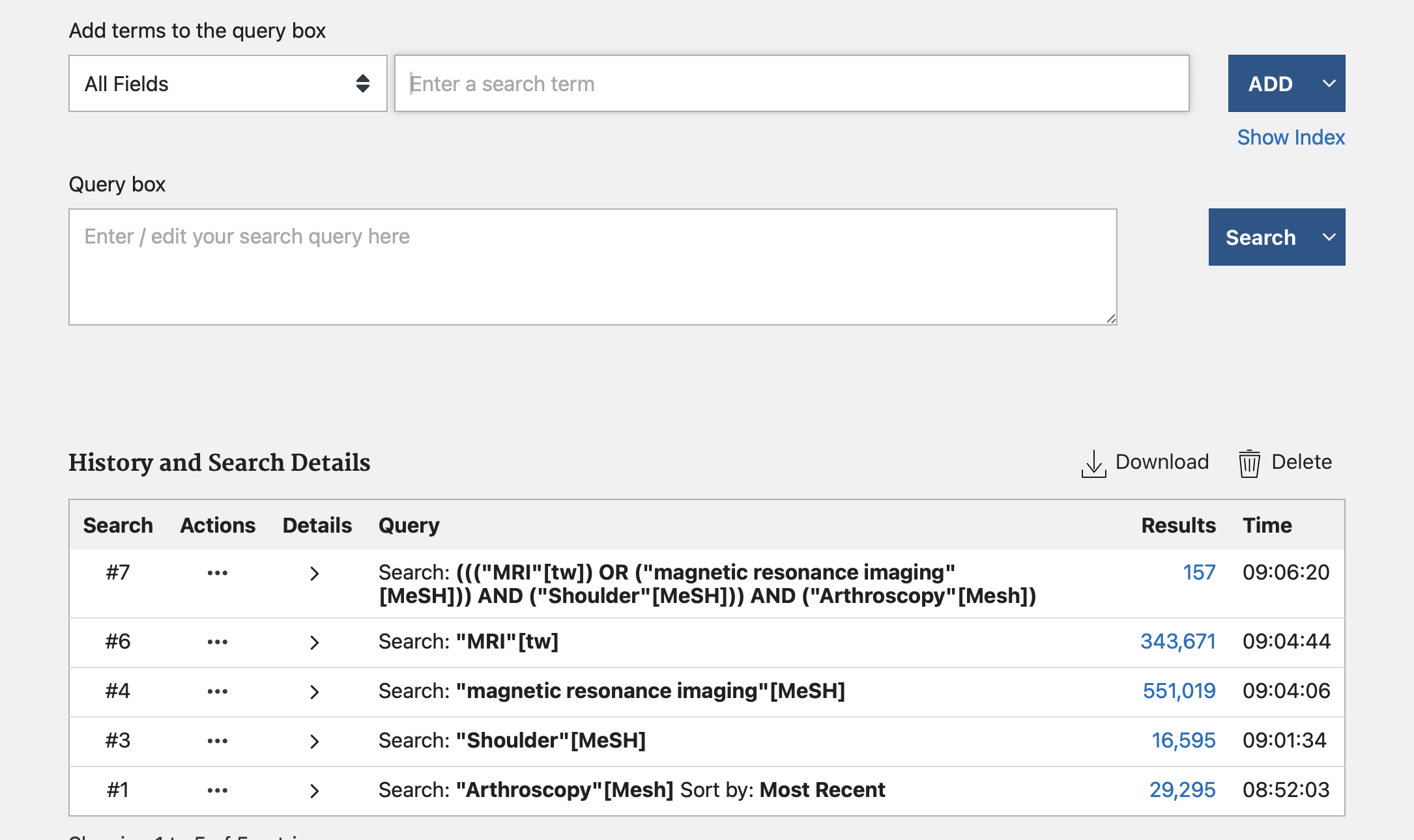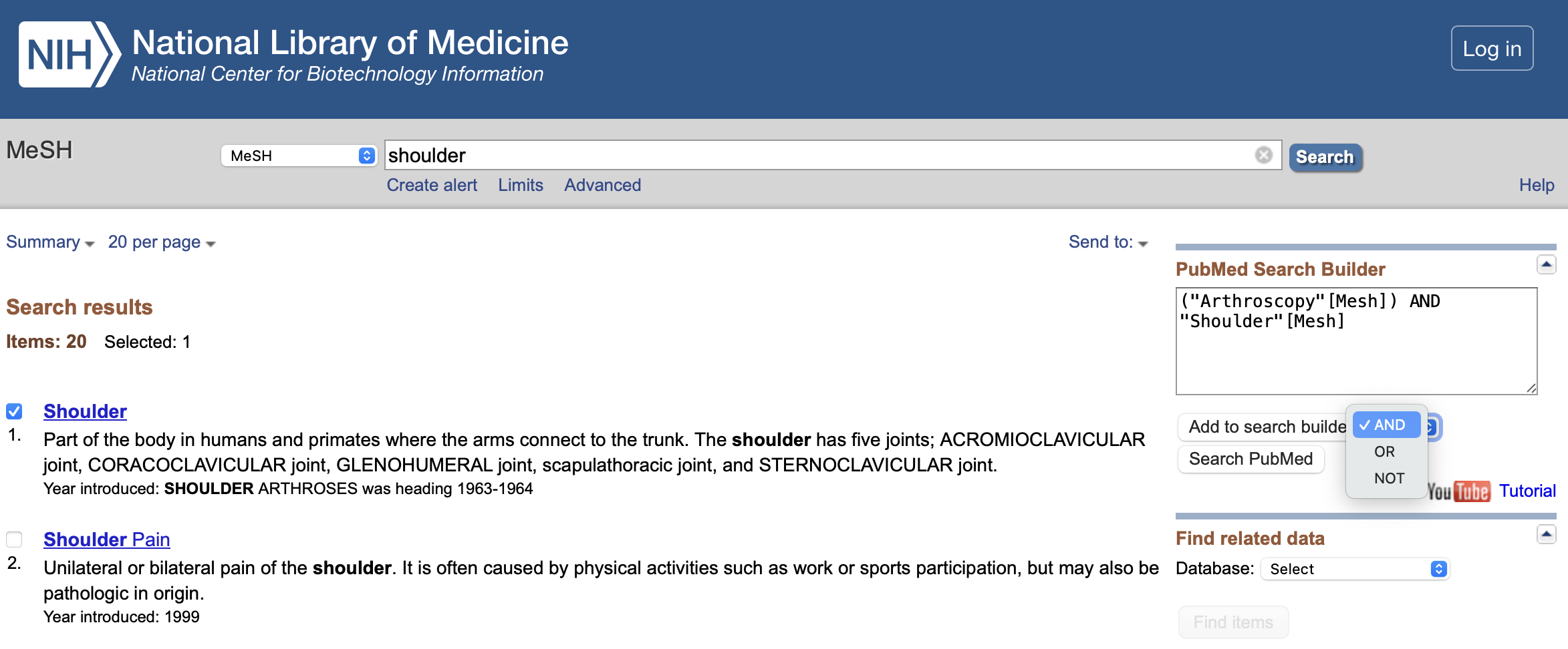 Having added the first search term, we may add the second search term, say “Shoulder” by following the previous steps and using any of the 3 Boolean operators of our choice. We can gradually build the search keywords by adding more and more terms to the query.