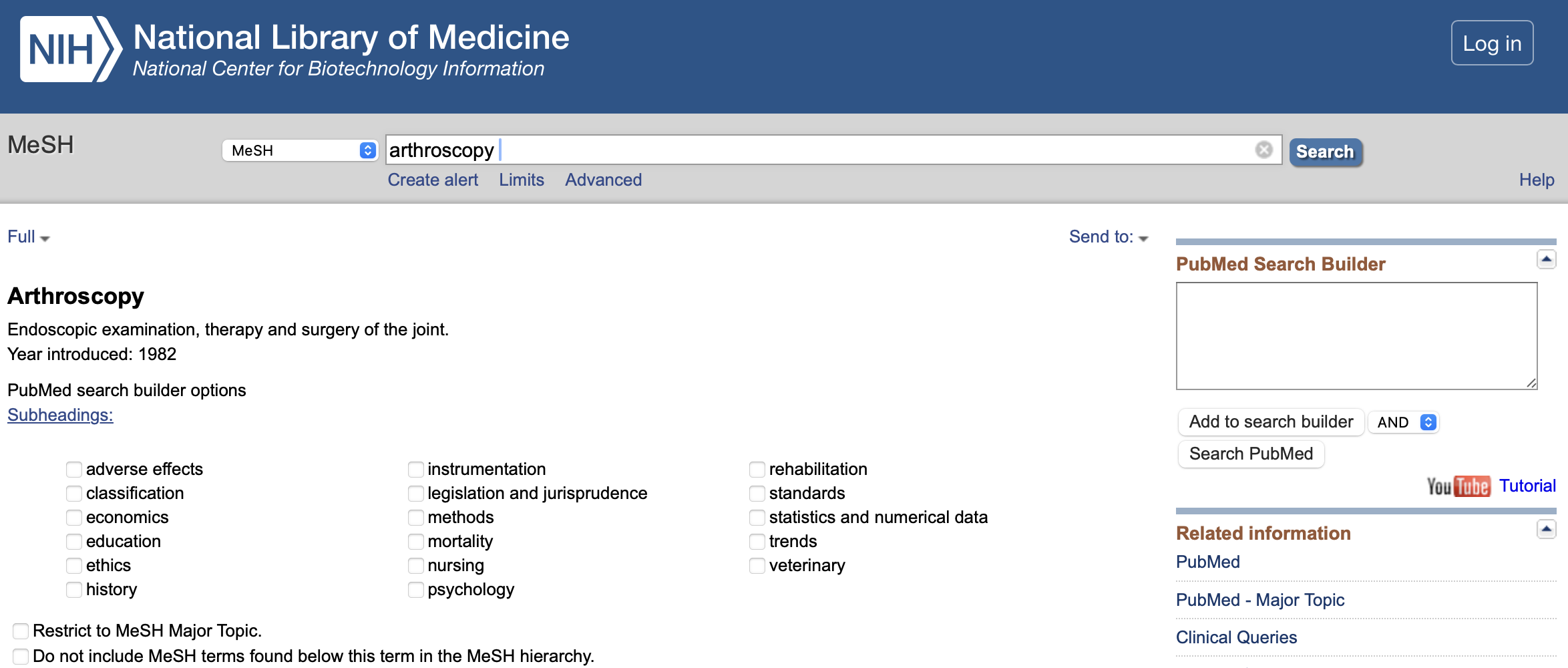 We can type in the keyword, say “Arthroscopy” and this will retrieve the proper MeSH term for that keyword. We can add that MeSH term to the search builder by clicking on the “Add to search builder” tab below the pubmed search builder.