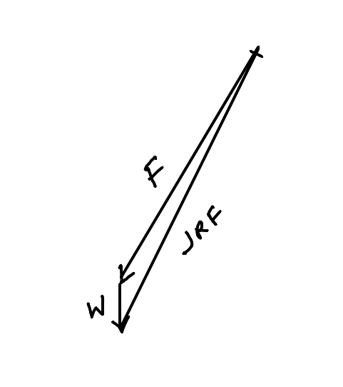 The quadriceps and patellar tendon are in equilibria, with a force 4F on either direction. The JRF is less than 4F. JRF is maximum when in flexion and negligible in extension of knee joint.
