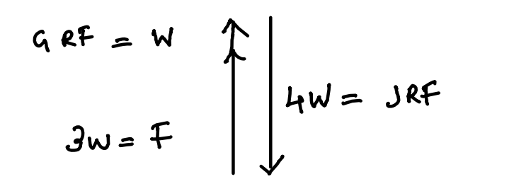 The quadriceps and patellar tendon are in equilibria, with a force 4F on either direction. The JRF is less than 4F. JRF is maximum when in flexion and negligible in extension of knee joint.