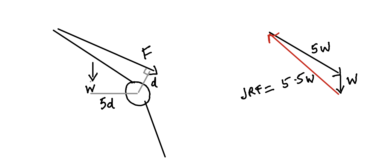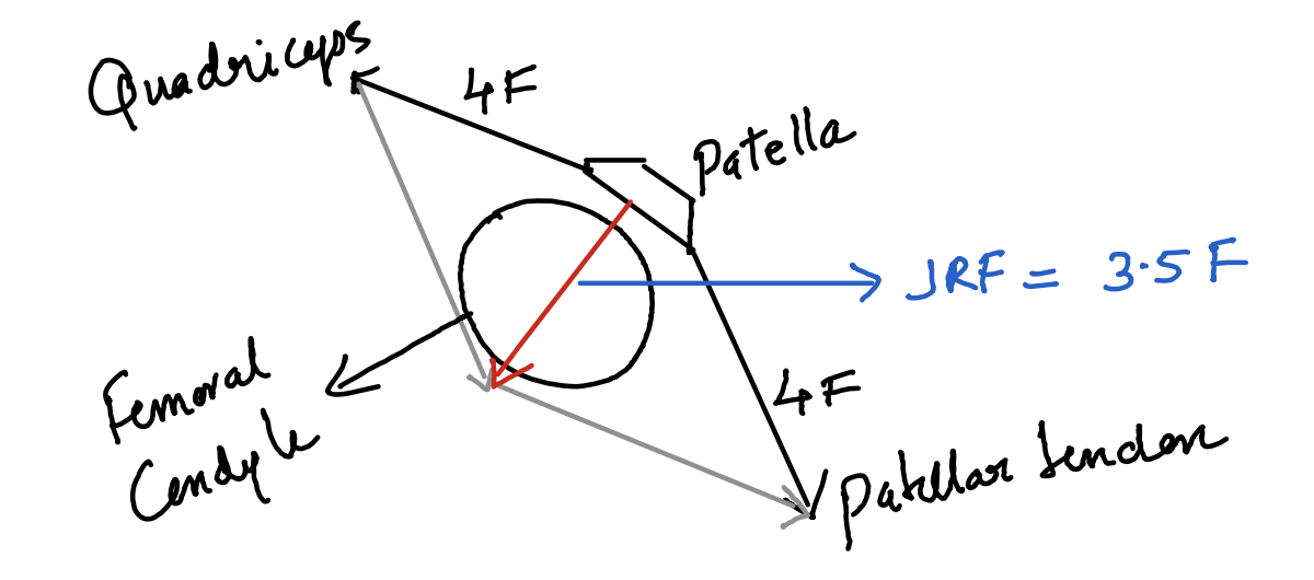 The quadriceps and patellar tendon are in equilibria, with a force 4F on either direction. The JRF is less than 4F. JRF is maximum when in flexion and negligible in extension of knee joint.